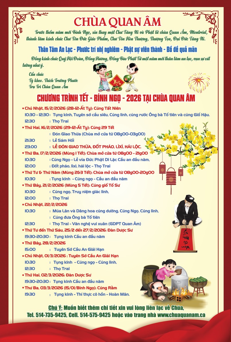 CHƯƠNG TRÌNH SINH HOẠT NĂM 2026 HẰNG NGÀY 05:00 Thỉnh Đại Hồng Chung 05:30 Công Phu Khuya 11:00 Cúng Ngọ 15:30 Thỉnh Đại Hồng Chung 16:00 Công Phu Chiều 19:00 Thỉnh Đại Hồng Chung HẰNG TUẦN Thứ Tư 19:30 – 20:30 Tuần đầu tháng: Tuần thứ 2,3&4: